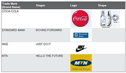 A trademark is a brand name, a slogan or a logo. It identifies the services or goods of one person and distinguishes it from the goods and services of another. A brand name is a word or combination of words (e.g. Kentucky Fried Chicken). A slogan is a short phrase or a sentence and a logo is a distinctive picture or symbol. They provide a distinctive identity in the marketplace and can apply to both products and services.Examples below: